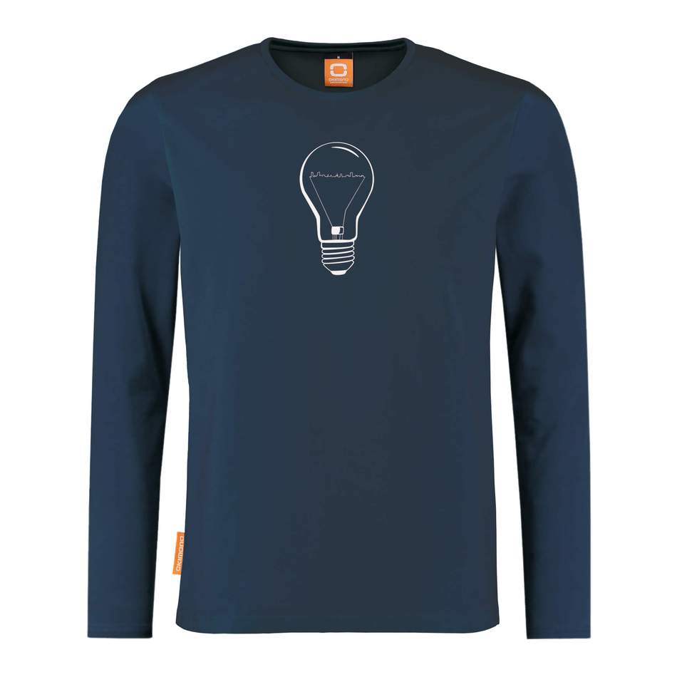 Okimono longsleeve lamp skyline donkerblauw. Een buitengewoon slim ontwerp met de skyline van Eindhoven als gloeidraad! Grafisch ontwerp ‘Skyline 040 – Lichtstad’ door Peter Groot, Harriet Wansink en Team Okimono en een ode aan onze eigen lichtstad.